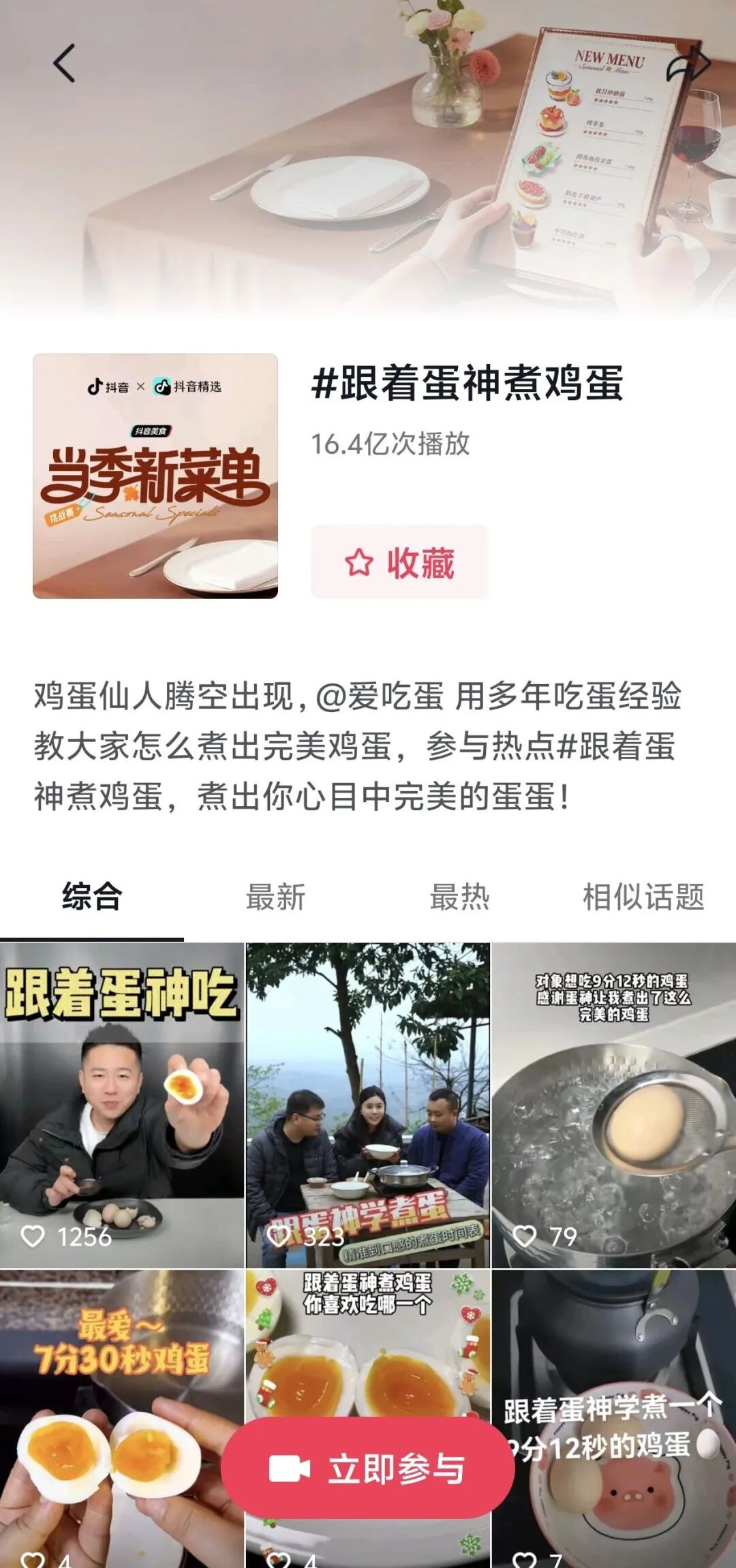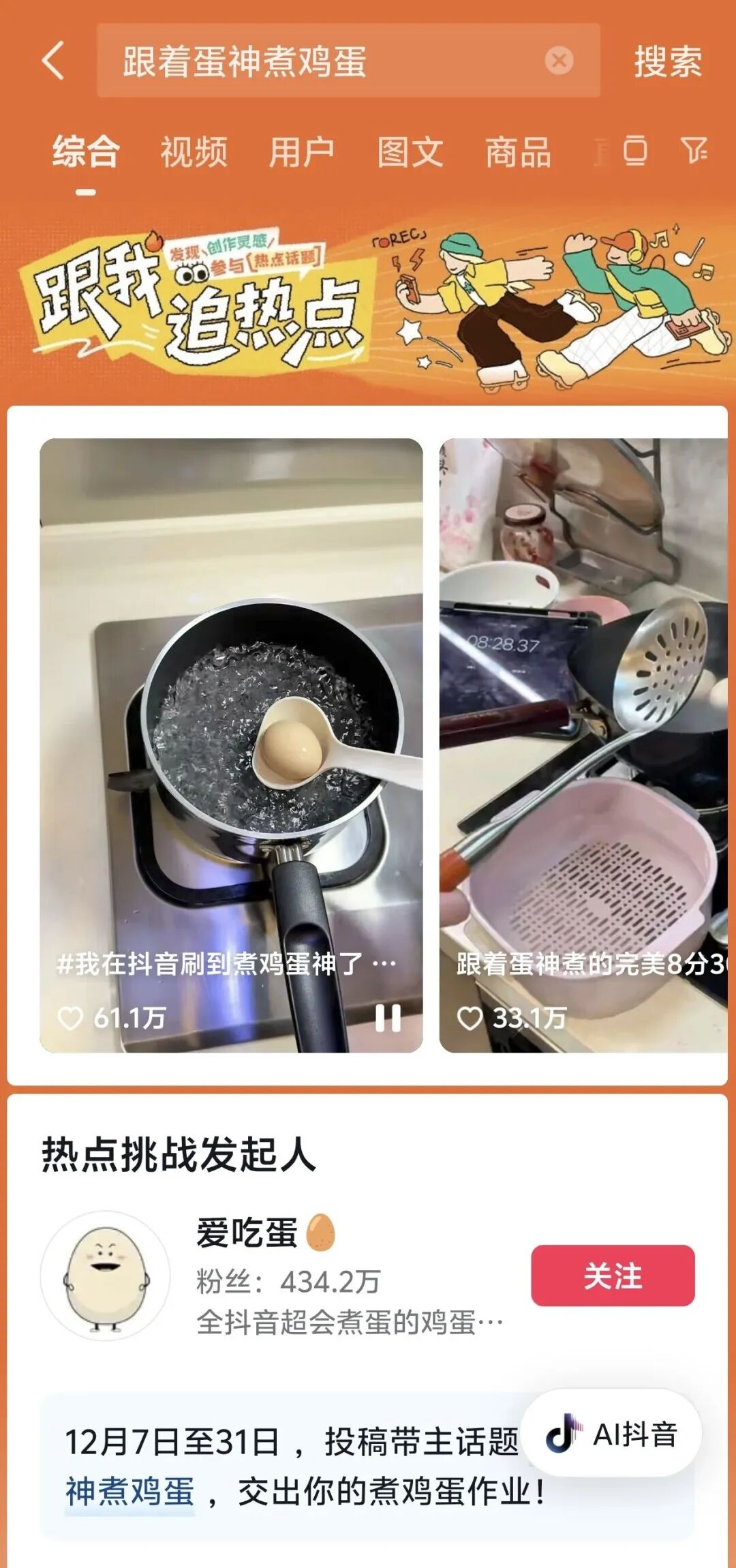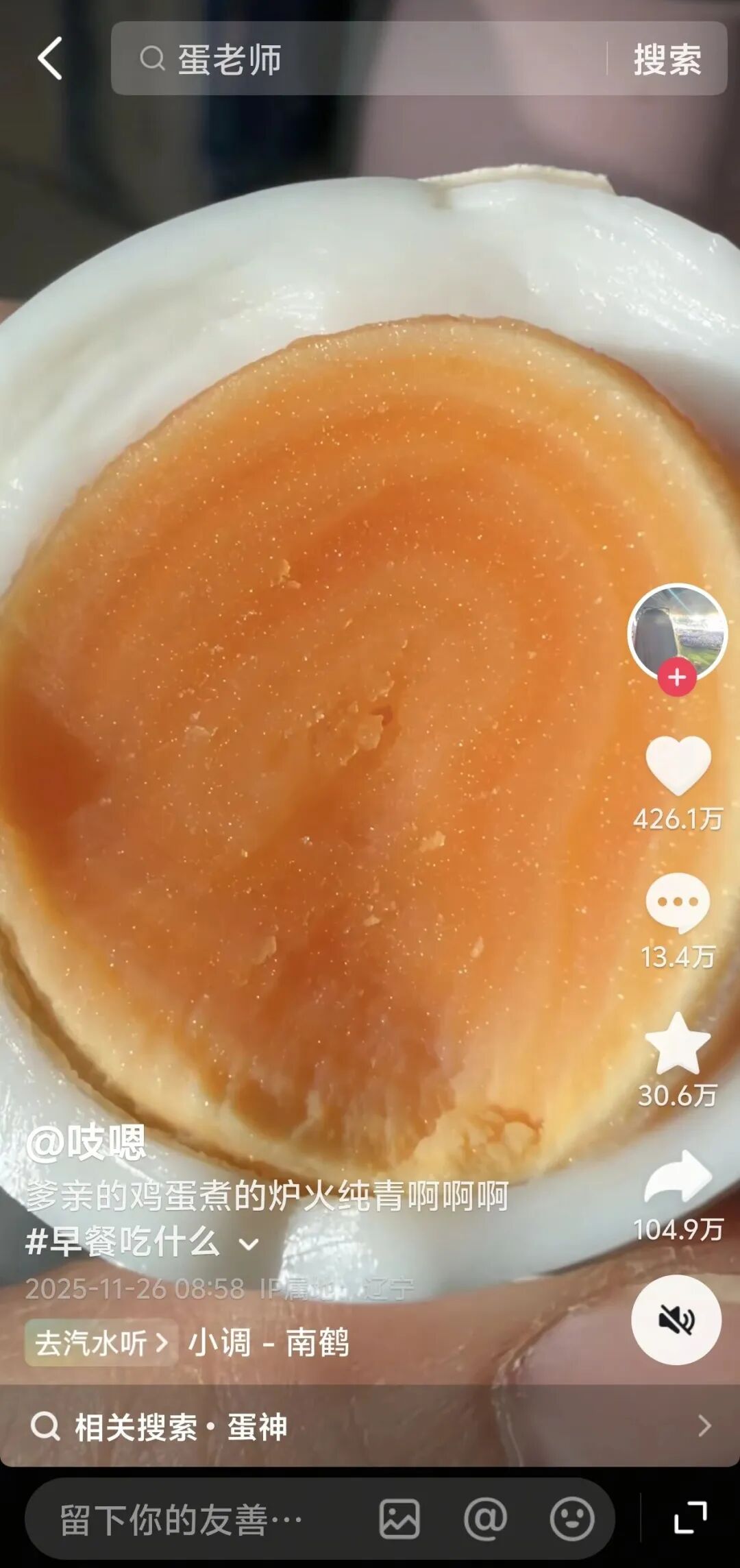 此前,该短视频拿下426万点赞、104万次分享,抖音话题“跟着蛋神煮鸡蛋”播放量达16.4亿次,热度席卷多平台热榜。