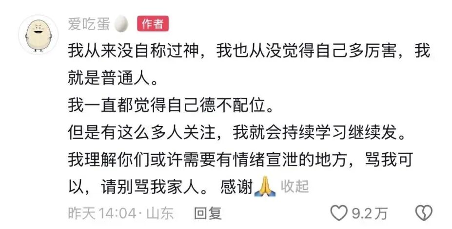 随着舆论持续发酵,质疑声浪愈演愈烈,“蛋神”身上的流量光环也逐渐变得黯淡。