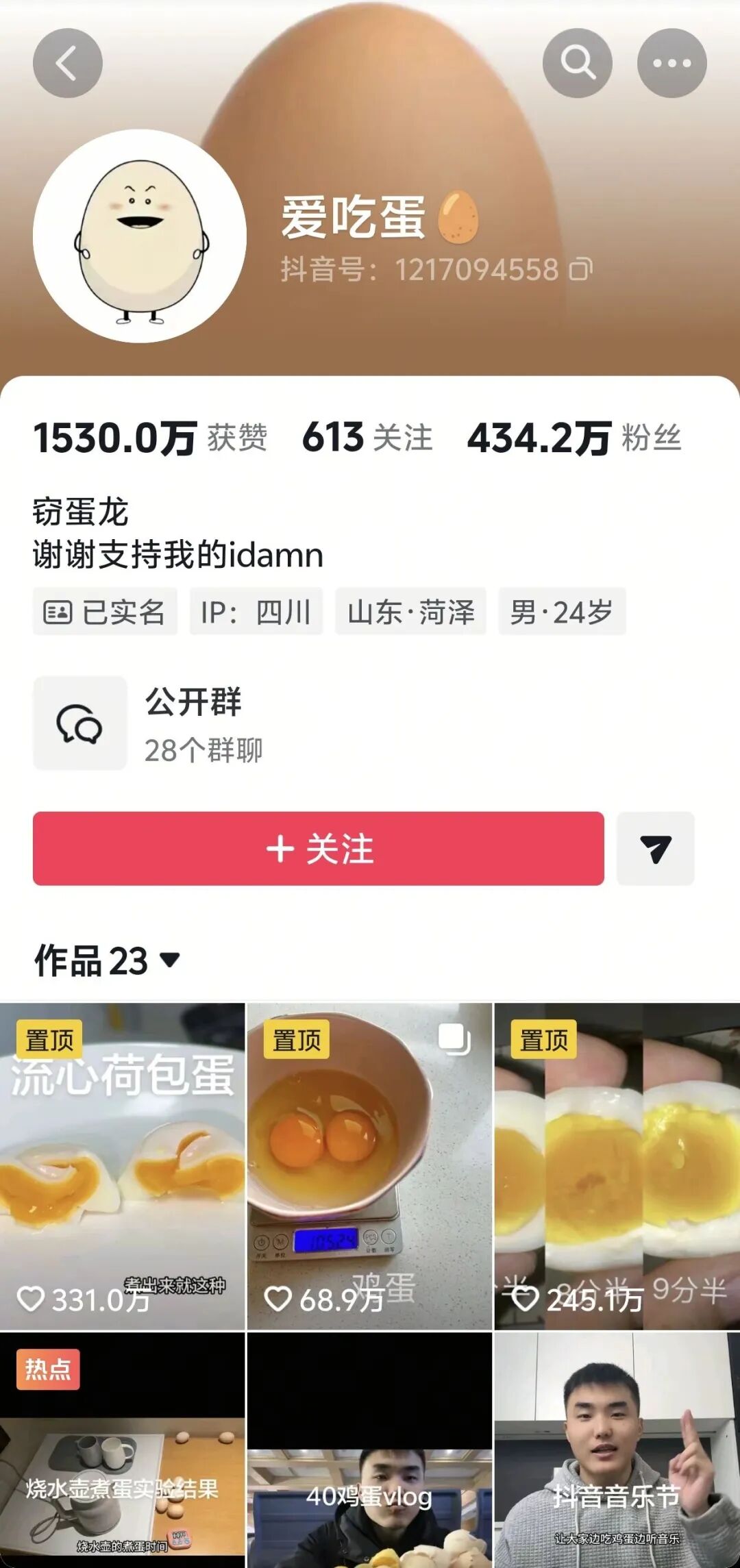 据李响查询发现,目前“爱吃蛋”的抖音粉丝数为434.2万,获赞1530万,其中发布的“流心荷包蛋”的置顶视频点赞量已达331万。