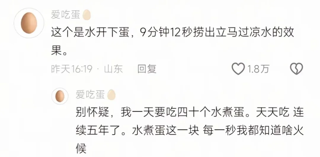故事最初,他只是一条关于“水煮蛋”视频下ID为“爱吃蛋”的普通网友,却因精确到秒、自称“一天吃 40 个水煮蛋” 的留言意外走红。